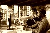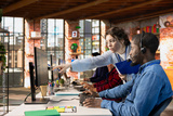 Customer service manager teaching new worker how to track support tickets in dedicated company software on computer. Call center supervisor shows african american intern how to create support tickets