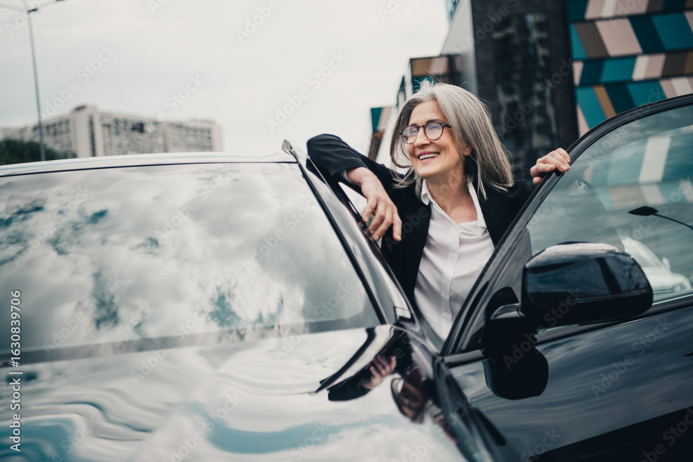 Successful mature businesswoman exiting car in an urban city setting on a bright day with professional attire