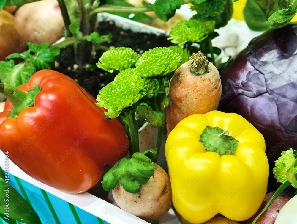 Vibrant vegetables freshly harvested from the garden showcase a colorful assortment of peppers and greens in a sunny market setting