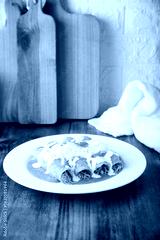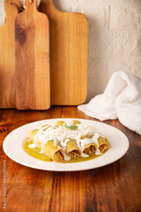Green enchiladas. Typical Mexican dish made with a folded or rolled corn tortilla filled with shredded chicken and covered with spicy green sauce, cream, grated cheese and onion.