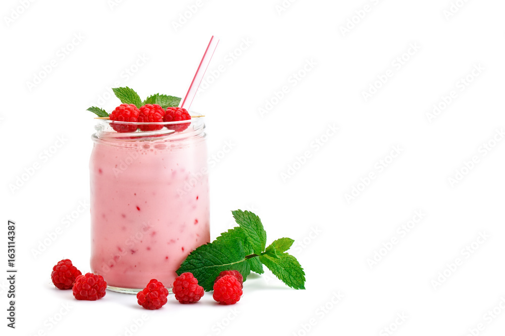 Mug of raspberry smoothie and berries of ripe raspberry on a white background.
