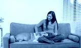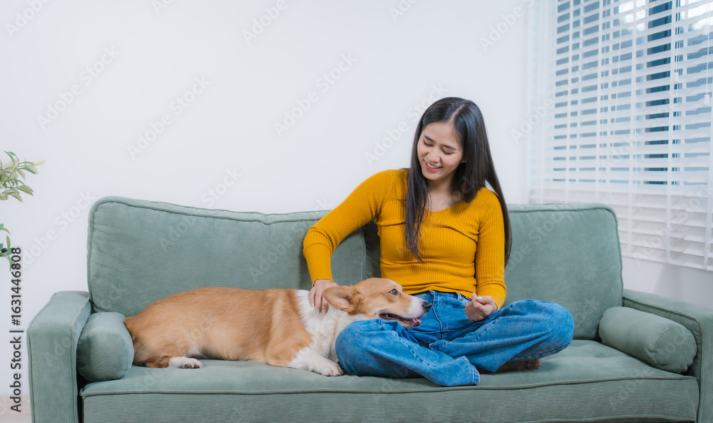 A young Asian woman sits on a cozy sofa at home with her Corgi. The indoor scene reflects warmth, happiness, and the loving bond between owner and pet during quiet leisure time