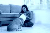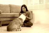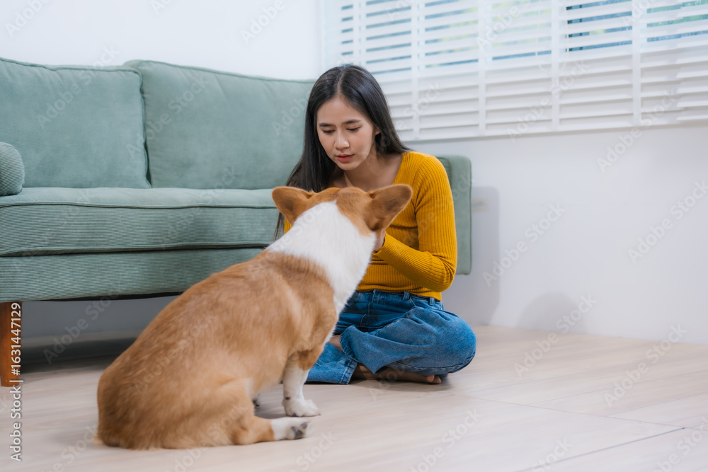 A young Asian woman sits on a cozy sofa at home with her Corgi. The indoor scene reflects warmth, happiness, and the loving bond between owner and pet during quiet leisure time