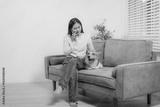 A cheerful Asian woman relaxes on her sofa with her playful corgi, using her smartphone to create engaging social media content, showcasing a cozy lifestyle filled with creativity, joy,companionship