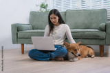 A cute Asian woman works from home beside her corgi on the sofa, using a laptop in relaxed environment.Their bond reflects balanced work-life, casual tech-driven productivity, joyful companionship