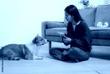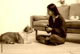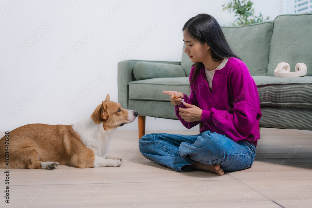 Asian woman sits on the floor at home, smiling while playing, training, and feeding her adorable corgi. Their loving bond reflects joyful pet care, indoor companionship, and happy lifestyle moments