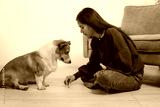 Asian woman sits on the floor at home, smiling while playing, training, and feeding her adorable corgi. Their loving bond reflects joyful pet care, indoor companionship, and happy lifestyle moments