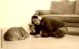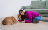 Asian woman sits on the floor at home, smiling while playing, training, and feeding her adorable corgi. Their loving bond reflects joyful pet care, indoor companionship, and happy lifestyle moments