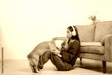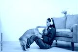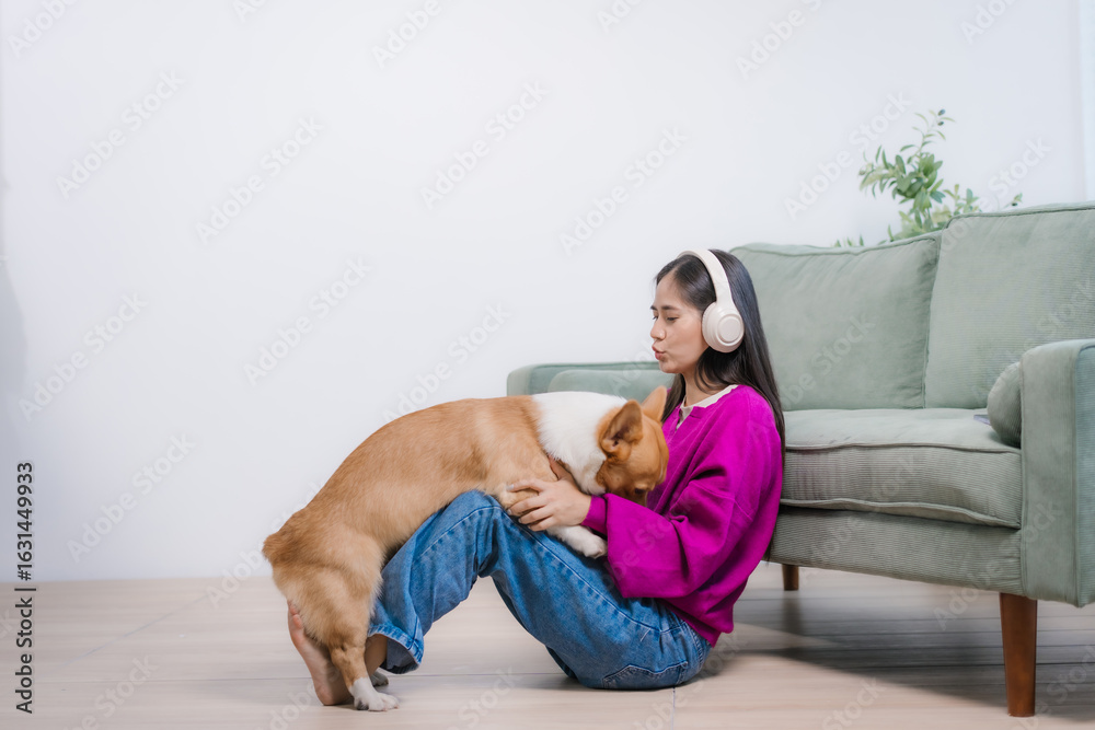 Asian woman sits on the floor at home, smiling while playing, training, and feeding her adorable corgi. Their loving bond reflects joyful pet care, indoor companionship, and happy lifestyle moments