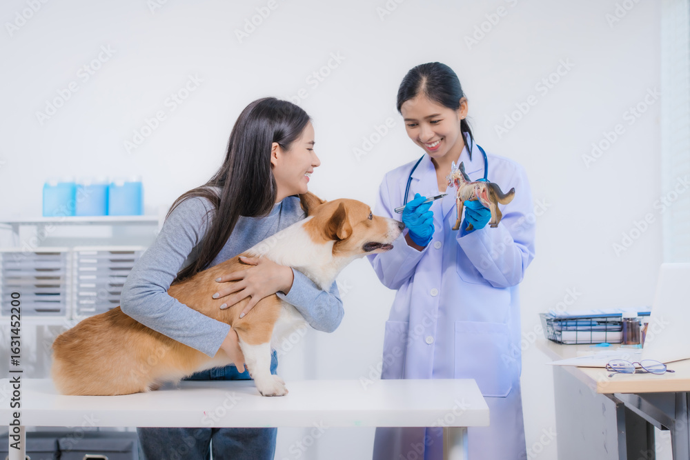 An Asian female veterinarian provides professional advice to a pet owner about her Corgi's illness. With compassion clarity, they discuss treatment,medications,care within a modern veterinary clinic