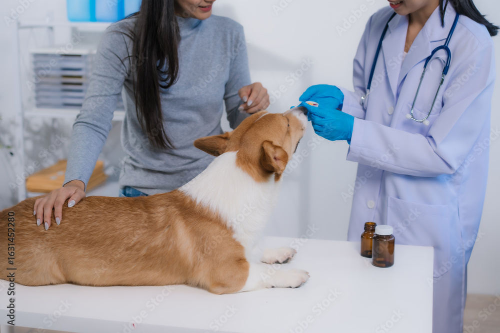 An Asian female veterinarian provides professional advice to a pet owner about her Corgi's illness. With compassion clarity, they discuss treatment,medications,care within a modern veterinary clinic