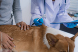 An Asian female veterinarian provides professional advice to a pet owner about her Corgi's illness. With compassion clarity, they discuss treatment,medications,care within a modern veterinary clinic