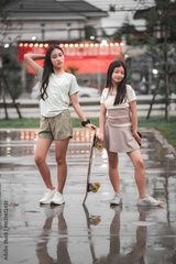 Young Skaters Posing Outdoors with Reflections in Wet Pavement