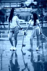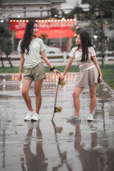 Two Friends Enjoying a Moment with Skateboard on Rainy Street