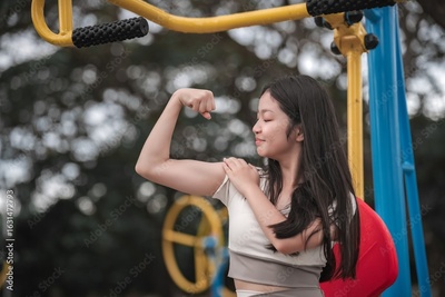 Strong Young Woman Showing Muscles in Outdoor Fitness Environment