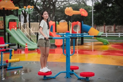 Young Woman Exercising at Outdoor Playground Fitness Equipment