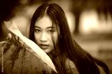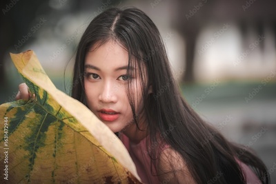 Young Woman Peeking Behind Large Leaf in Outdoor Setting