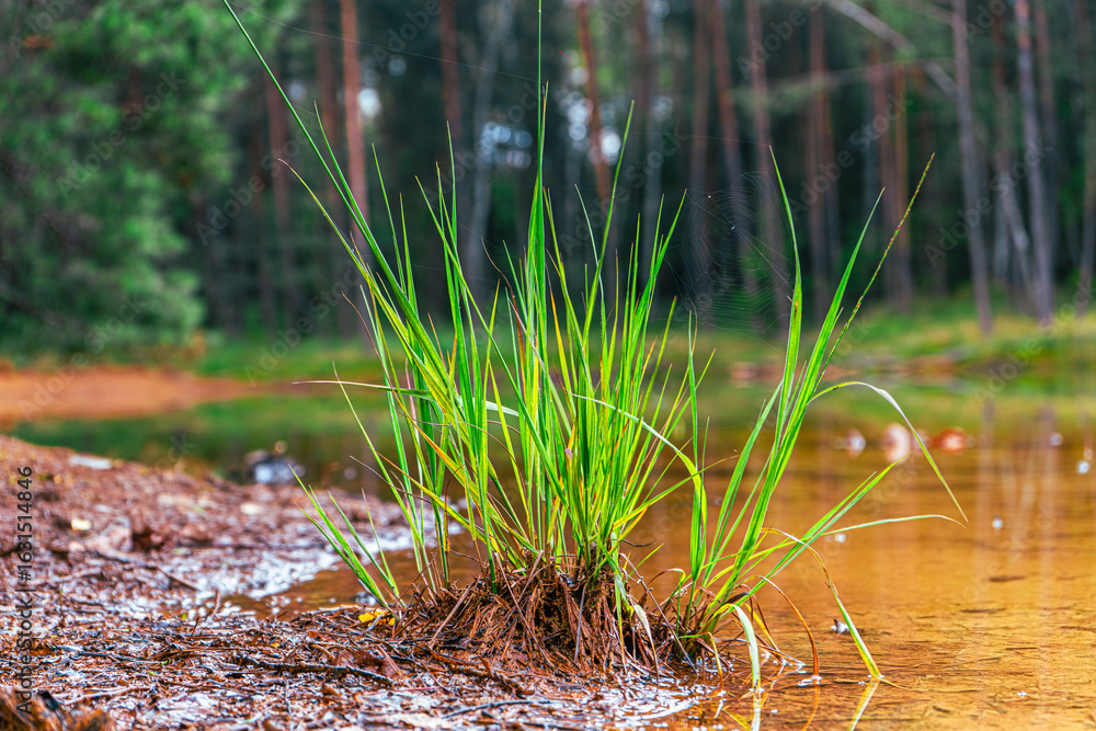 Trawa nad stawem z pięknym kolorem wody w lecie. Ciekawe tło do komputera.