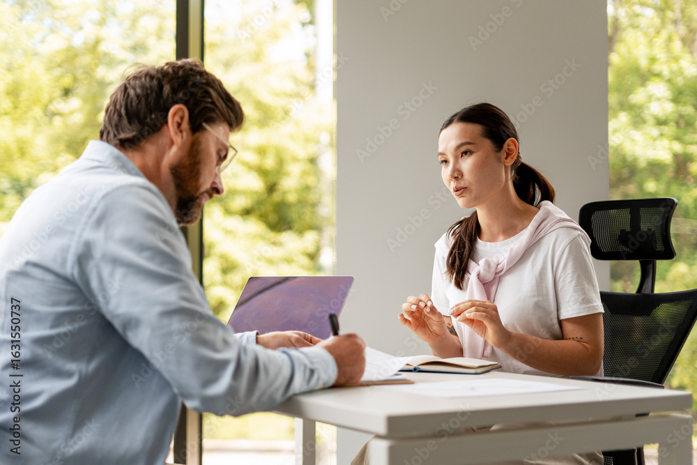 Asian businesswoman explaining strategy to manager taking notes during a meeting