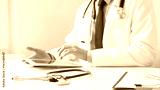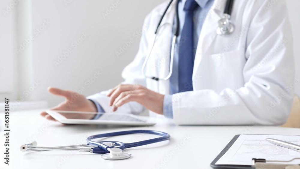 Male doctor wearing white medical coat and stethoscope is using digital tablet while sitting at desk in medical office, with medical chart and pen in the foreground. Medicine and health care concept