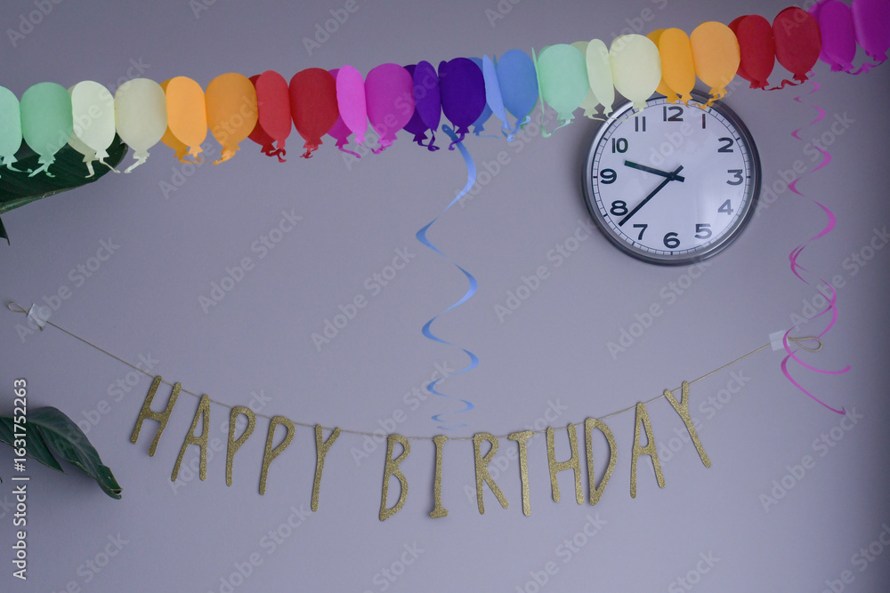 Colorful birthday decorations with a clock showing afternoon time and vibrant balloons hanging across the wall