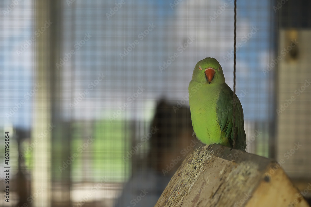 Green Parakeet Perched on Wooden Block in Aviary with Mesh Background
