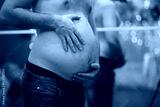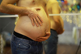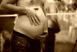 Pregnant Man Holding Belly in Jeans in Front of Mirror with Lights in Background
