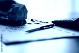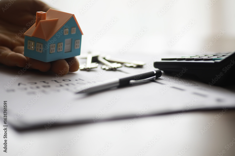 Real Estate Contract Signing with House Model, Keys, and Calculator in Focus