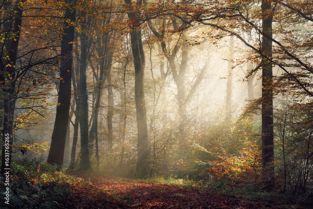 Magical nature scenery with beautiful golden mood in a foggy forest in autumn, with the rays of sunlight illuminating the mist through the tree trunks along a path
