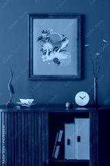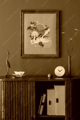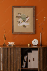 Decorative setup of arrangement with mock up poster art, wooden cabinet and minimalist accessories styled against an orange wall.