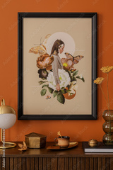 Close-up of eclectic interior styling with mock up artwork, brass lamp and ceramic accessories in a warm-toned setting.