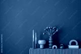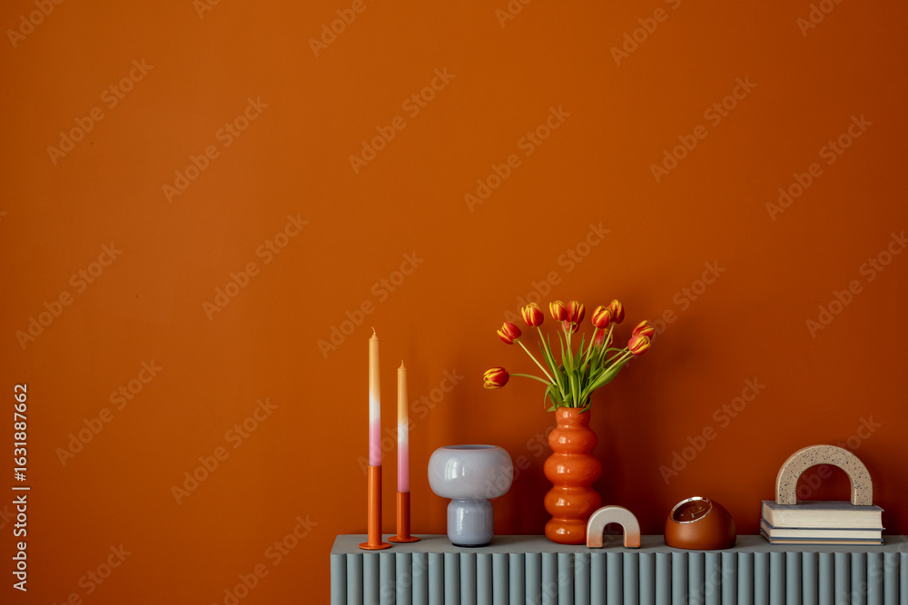 Contemporary decor with tulips in an orange vase, pastel candle holders and sculptural accents on a fluted blue console. Copy space.