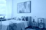 Contemporary bedroom in beige and white tones with mock up abstract wall art, modern lighting and carefully curated accessories.
