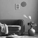 Modern concept of domestic interior with design sofa, wooden room screen, pillow, blanket, picture frame , side wooden stool and elegant personal accessories in stylish home decor. Template.