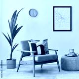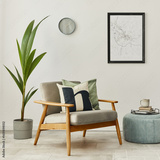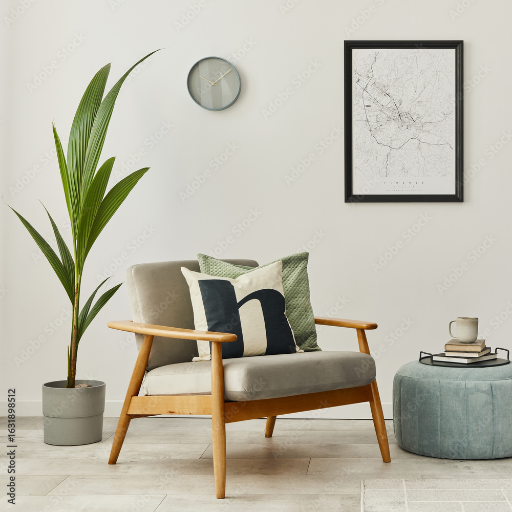 Modern retro concept of home interior with design grey armchair, coffee table, plants, mock up poster map, carpet and personal accessories. Stylish home decor of living room.