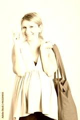 Beautiful pensive young blonde pregnant woman with shopping bags posing. Pregnancy, motherhood, sale, people and expectation concept. Isolated on background.