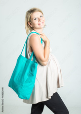 Beautiful happy young blonde pregnant woman with shopping bags posing. Pregnancy, motherhood, sale, people and expectation concept. Isolated on background.