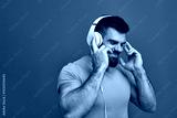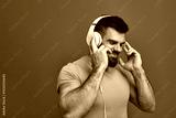 A man wearing a yellow shirt listens to music with white headphones while smiling. He appears relaxed and absorbed in the sound in a casual studio environment