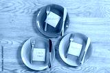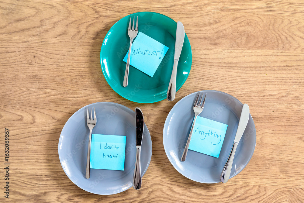 Plates with Sticky Notes Saying 'Never Mind', 'I Don't Know', and 'Whatever' – Conceptual Still Life on Emotional Detachment and Apathy