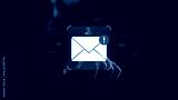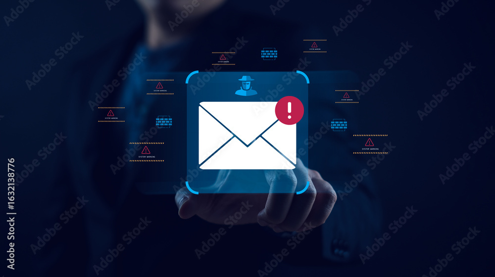 warning email icons cybersecurity alert, scam message A hand reaching digital alert surrounded by various warning icons, suggesting a focus on technology email threat, phishing attack, malware, data