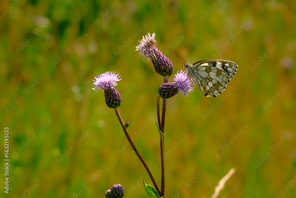 Checkerspot butterfly (Melanargia galathea) on a thistle flower close-up