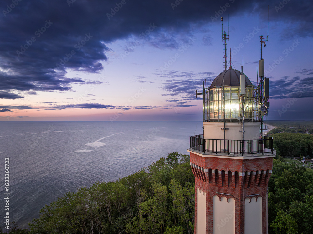 Unique lighthouse at sunset in Rewal at Baltic Sea.