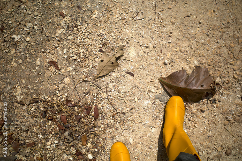 Dry and cracked land and yellow boots in Gunung Kidul Yogyakarta, Indonesia due to the long dry season