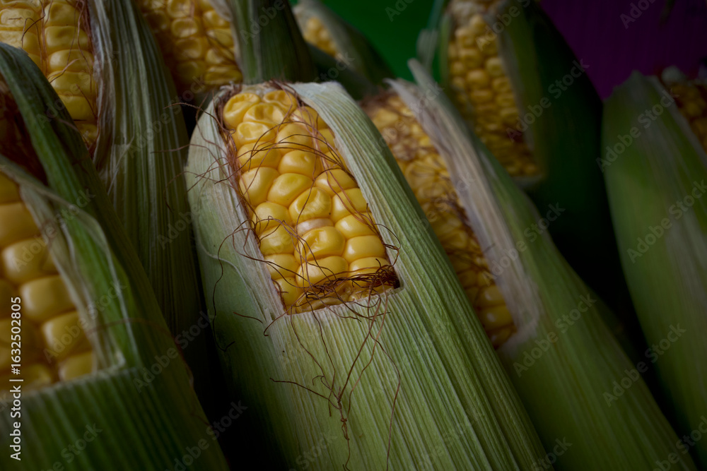 Fresh sweet corn, just harvested from the fields, sold at a traditional market in Yogyakarta, Indonesia
