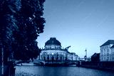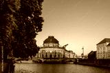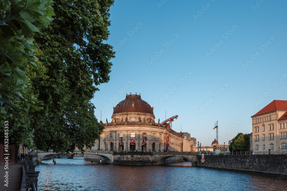 The historic Bode Museum on Museum Island in Berlin, Germany, seen from across the Spree River at sunset.