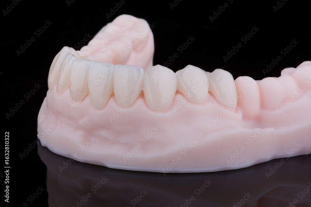 Quality dental zirconium crowns of lower jaw stylized as young bright teeth on 3D printed model.