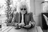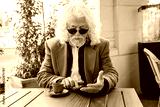 Elderly gentleman with curly hair interacting with a smartphone, sipping coffee and deeply engaged with the mobile application, showcasing a moment of concentration and technology use in daily life