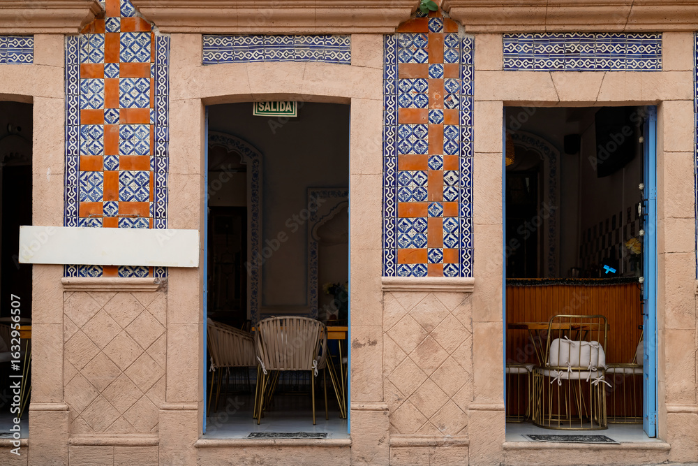 Tiled building with EXIT sign above doorway and visible restaurant seating in Bernal, Mexico