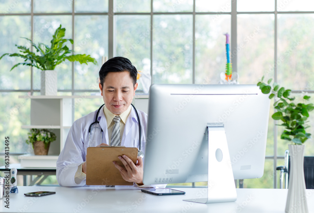 Asian male doctor in white coat with stethoscope, sitting reading paperwork for results at desk in modern hospital medical clinic office, research professional healthcare insurance wellness technology