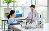 Asian male doctor in white coat with stethoscope, consulting explain medications to senior female patient professional support trust healthcare checkup, insurance treatment wellness in hospital clinic
